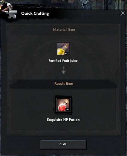 3) Click 'Craft' to craft a Fortified Fruit Juice into an Exquisite HP Potion. (The potion will bound to this character.)