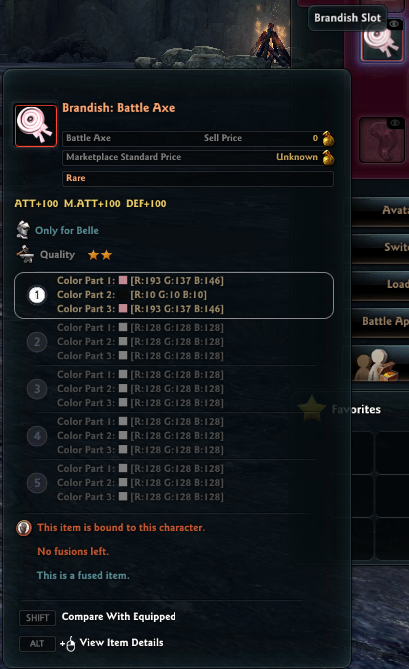 Please not that you cannot fuse an item with the same appearance as the brandish. See below for the criteria on the crafted appearance per brandish.
