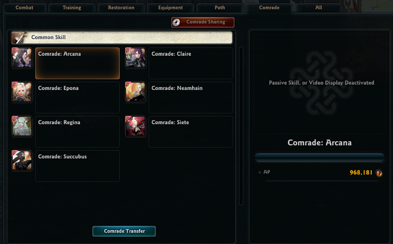Using the "Comrade: OOO" item will add the corresponding comrade skill to the Skills > Comrade tab.
