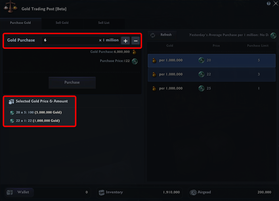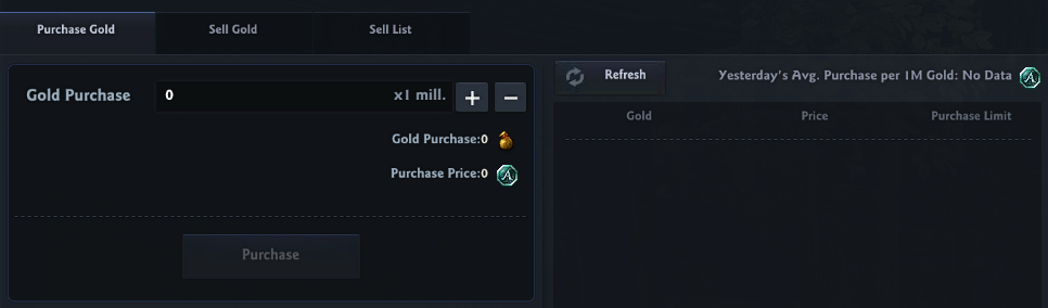 - When purchasing gold, be sure to check the 'Previous Day's Average Price per 1,000,000 Gold' at the top of the sales list, along with the selected gold price and quantity.