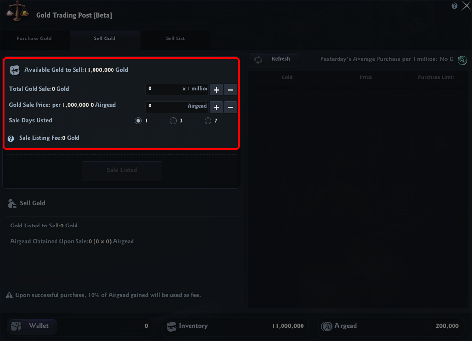 In the 'Sell Gold' section at the bottom left, you can view the gold you've registered for sale and the amount of Airgead you'll receive upon sale.