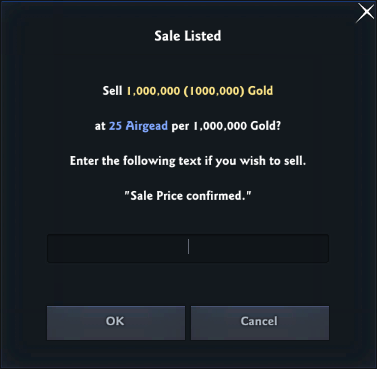 In the Gold Trading Post > Sell Gold tab, you can register gold for sale by specifying the amount of gold you wish to sell and setting the Airgead price per 1,000,000 Gold.