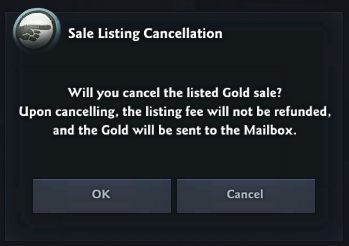 In the list, you can view the amount of gold you've registered for sale, the price per 1 million Gold, the remaining sale period, and the amount of Airgead you'll receive upon a successful sale.