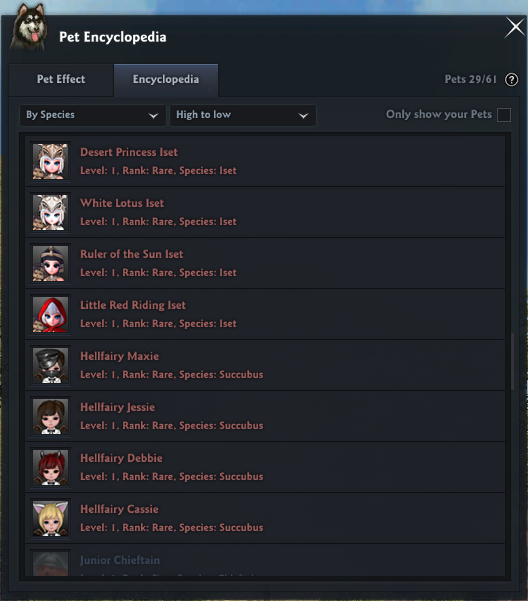 In the Pet Encyclopedia, you can view detailed information about your active Pet as well as the bonuses you receive based on the Pets you own, all in one place.