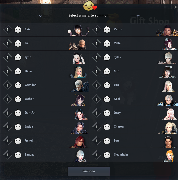 You can see a list of all the mercs who are not currently in the lounge from the "Summon" window. From the list you can select a Hero you would like to call.