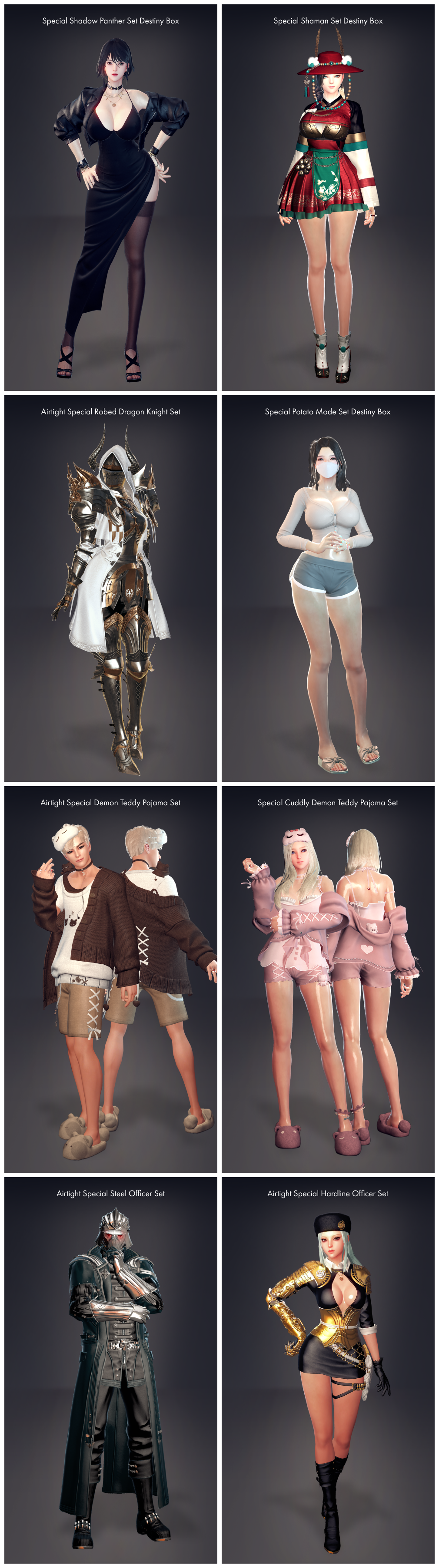 - Certain parts of outfits may not display as intended if worn with outfits/equipment from another set. Please use the Wardrobe to preview before purchasing.